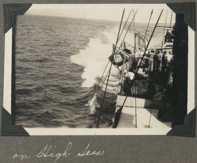 Subject: View toward the bow of a U.S. Army troopship on the Pacific Ocean. Per OFI-001276, Lester sailed on the army transport "Thomas" in 1927.