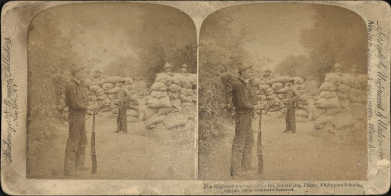 Underwood #U1190. U.S. soldiers stand guard at sand-bagged checkpoint on road in Pasay City, Philippines.