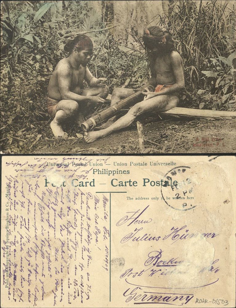 Subject: Indigenous Philippine man holds stringed bamboo tube instrument while another man pulls strings. Postally used