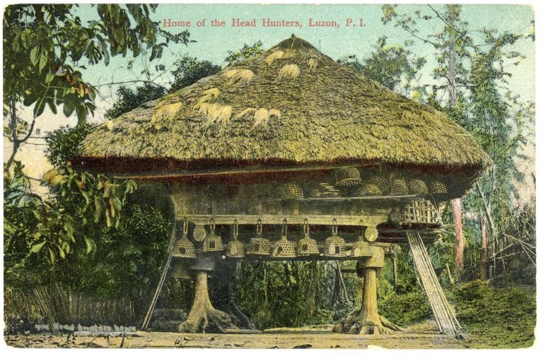 Unusual nipa hut built on tree trunks rather than poles, featuring rows of birdcages or hen houses attached to pegs.