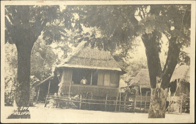 Subject: Person stands at window inside high-roofed nipa house seen through two street trees.