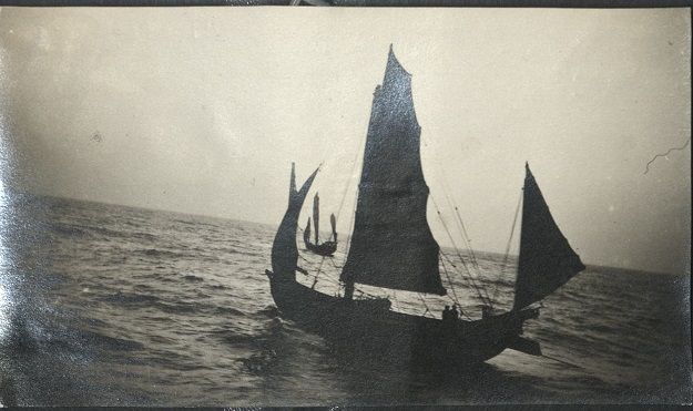 Subject: View from a passenger ship in Hong Kong harbor of a Chinese junk on choppy seas.