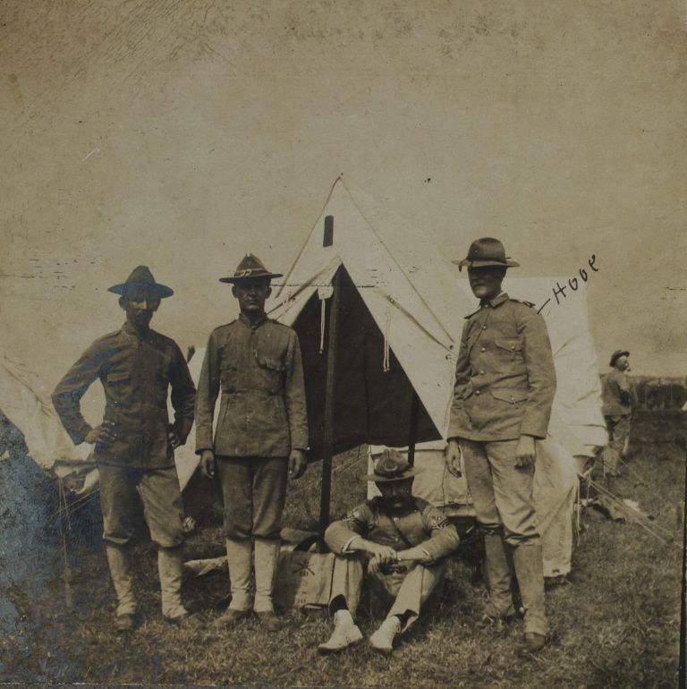 Subject: Very similar to OFI-002099. Four U.S. soldiers pose in front of their tents and cots. Per the caption on OFI-002042a, Camp Wallace was originally located on the Luneta. Other sourc