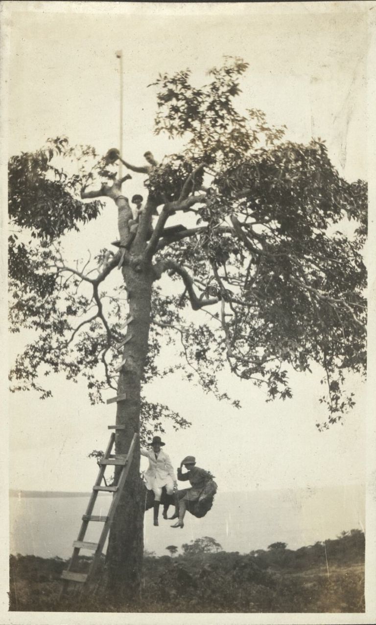 Subject: Haggelsteins and Kincaids (?) sitting in a tree on Corregidor Island. The feat of the pair at tree top is slightly less impressive when one notices the wooden steps hammered into the trunk.