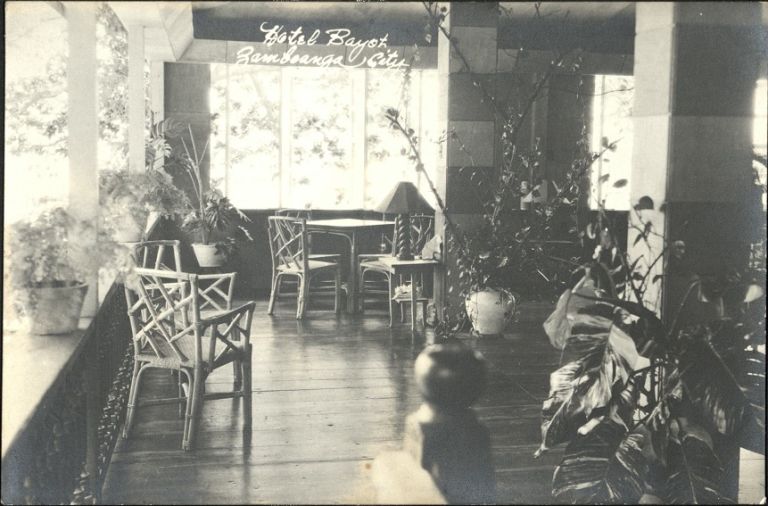 Subject: Lobby of Hotel Bayot, Zamboanga City, with potted plants and rattan furniture. Originally the officer�s quarters and club in the American period, it was purchased by Mr. Antonio Bayot, who