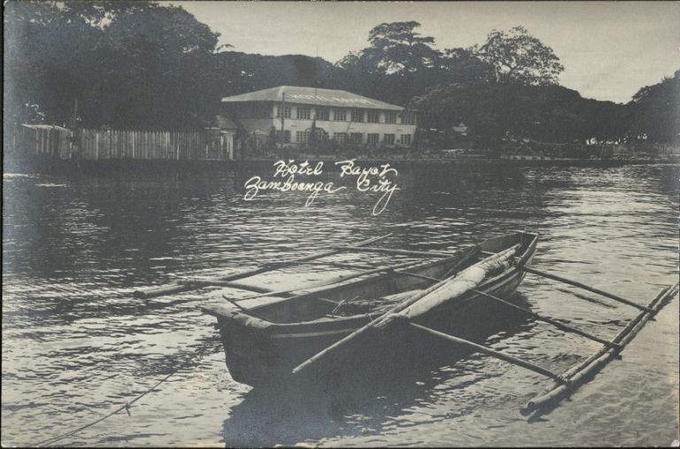 Subject: Boat in river by Hotel Bayot, Zamboanga City. Originally the officer�s quarters and club in the American period, it was purchased by Mr. Antonio Bayot, who ran it as a fashionable seaside r