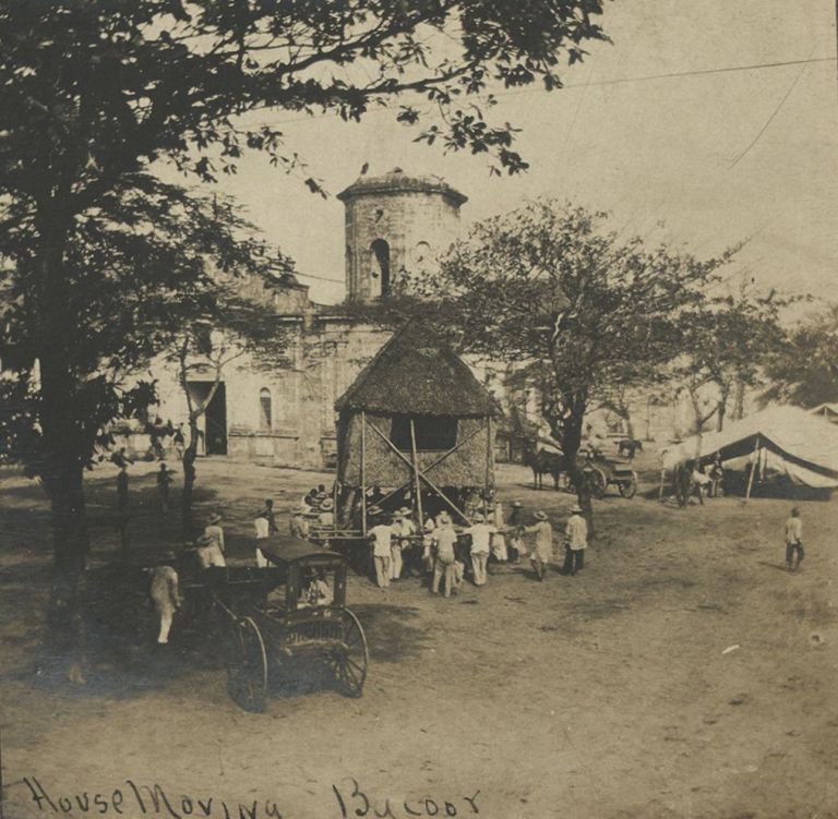 Subject: One advantage of nipa construction is a house can be moved by your neighbors (see also OFI-002406). This is in Bacoor, Cavite. The church is St. Michael the Archangel Parish, estab