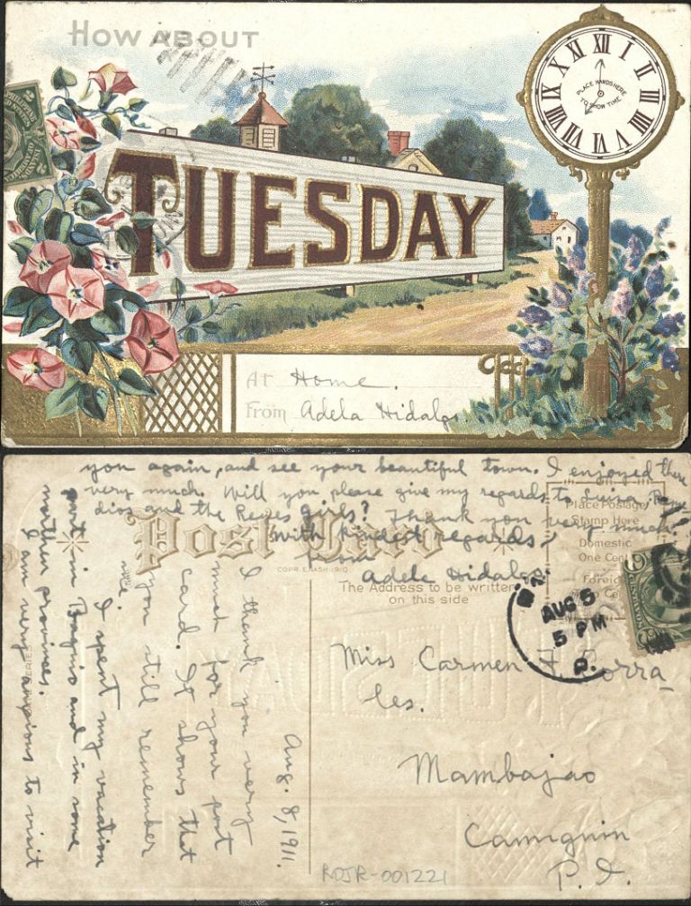Subject: Flowers, country road, post with clock right, large billboard �Tuesday.� An invitation card used as a greeting card.