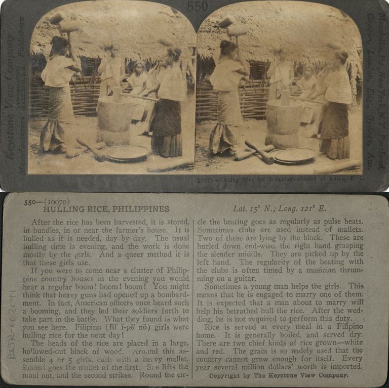 Keystone #K10070-I. Young Filipina women pound rice using mallets and clubs around a large wooden pestle.