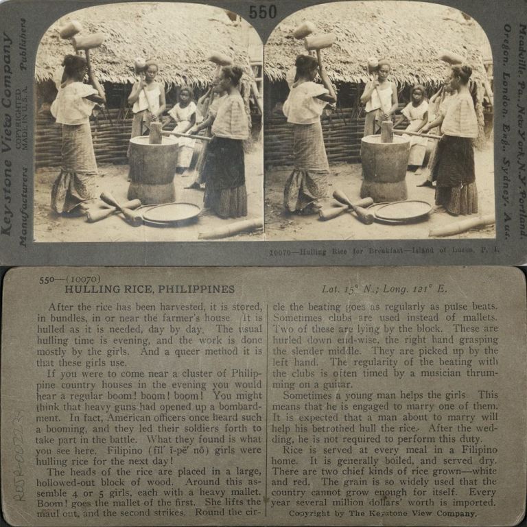 Keystone #K10070-I. Young Filipina women pound rice using mallets and clubs around a large wooden pestle.