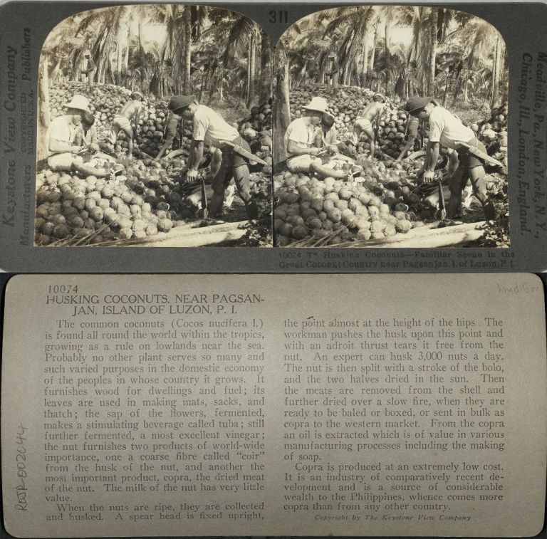 Keystone #K10074-II. Filipino men husk coconuts manually amid mountains of coconuts and shells in Pagsanjan.