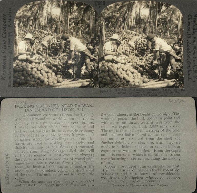 Keystone #K10074-IV. Filipino men husk coconuts manually amid mountains of coconuts and shells in Pagsanjan.