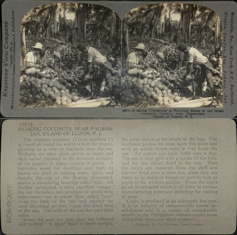 Keystone #K10074-II. Filipino men husk coconuts manually amid mountains of coconuts and shells in Pagsanjan.