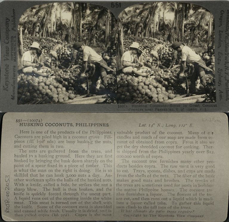 Keystone #K10074-III. Filipino men husk coconuts manually amid mountains of coconuts and shells in Pagsanjan.