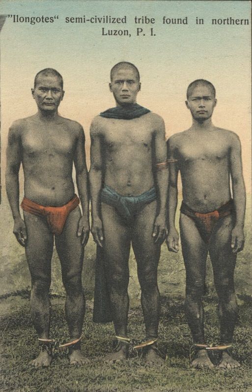 Subject: Three male Ilongots, naked except for loincloths and ankle devices. The Ilongots are an indigenous tribe in Luzon who inhabit the southern Sierra Madre and Caraballo Mountains, primarily in t