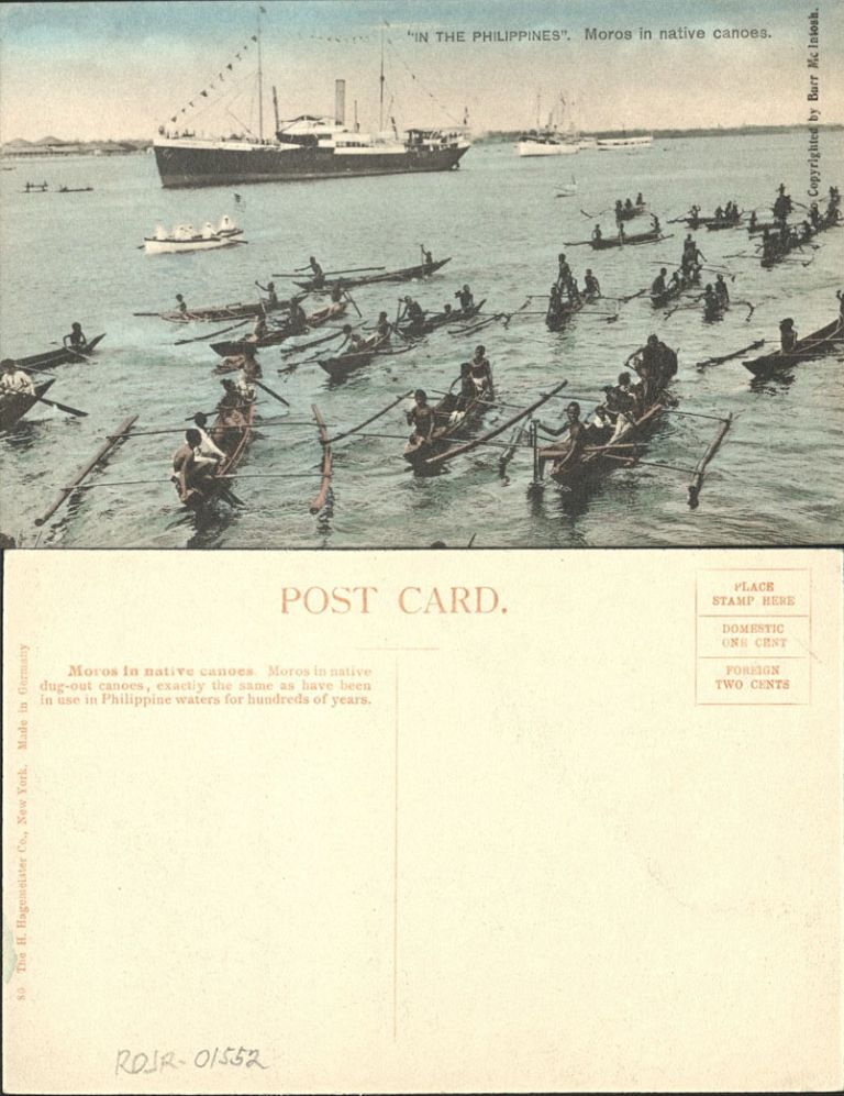Subject: Outrigger canoes greet steamship and passengers in bay. Full caption: �Moros in native dug-out canoes, exactly the same as have been in use in Philippine waters for hundreds of years.�