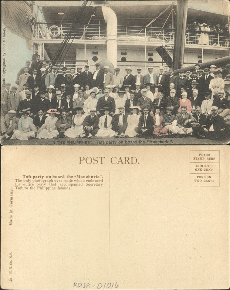 Subject: Smartly-dressed group posing on deck of �Manchuria� amidships, enroute to Philippines, circa 1905; William Howard Taft, center, served as U.S. Secretary of War (1904-1908) prior to being