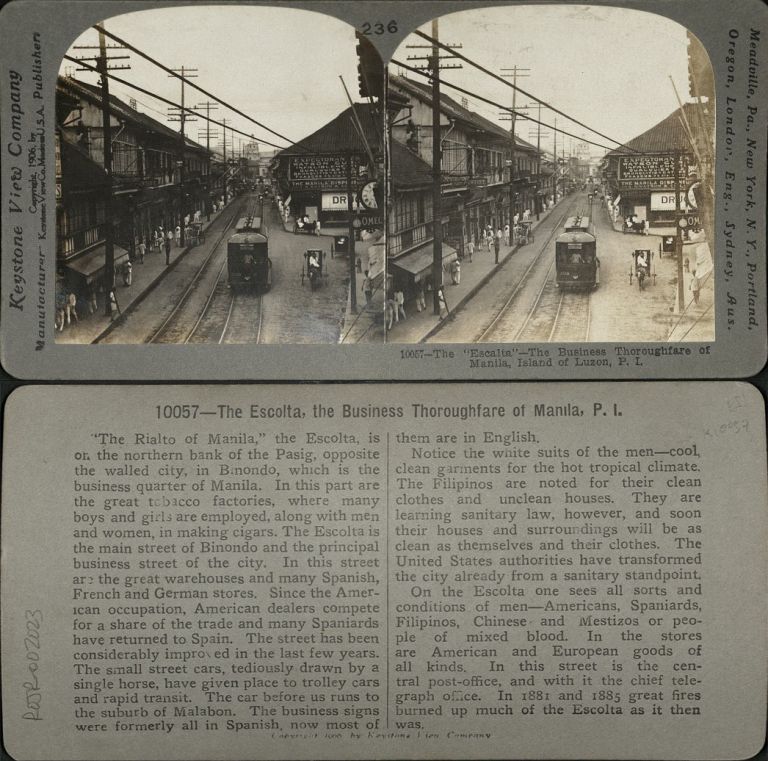 Keystone #K10057. View from 2nd story down Escolta St., with streetcar, calesa, and pedestrians.