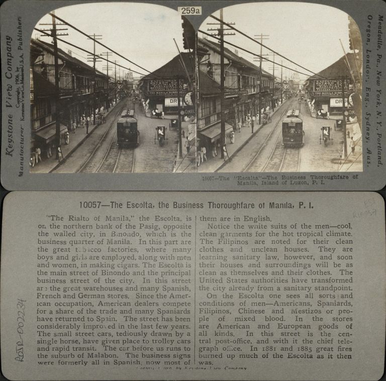 Keystone #K10057. View from 2nd story down Escolta St., with streetcar, calesa, and pedestrians.