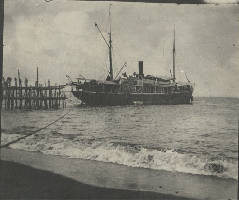 Subject: An inter-island steamship tied up to shore being loaded by workers on a crude wooden pier.