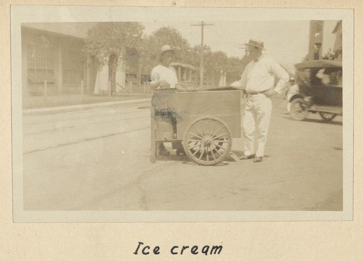 Subject: An early version of the ice cream truck. Filipino ice cream vendor prepares a treat for an American man from a cart in the street, probably in Manila. Automobile in background