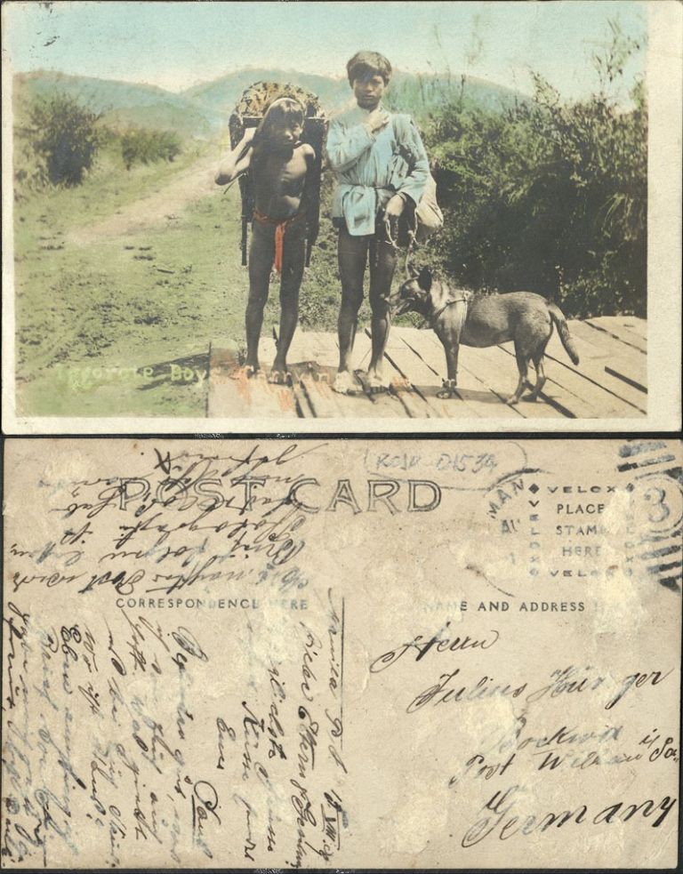 Subject: Two Igorot boys standing on wood planks in hilly country, one with a dog, the other carrying a backpack.