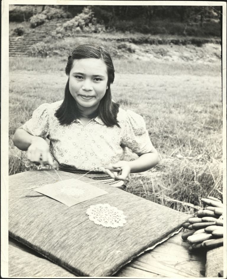 Subject: A young Igorot girl smiles at the viewer while making lace, likely at St. Mary's School (the Mission of St. Mary the Virgin) in Sagada, also known as the "Girl's School." See http://smssaff.s