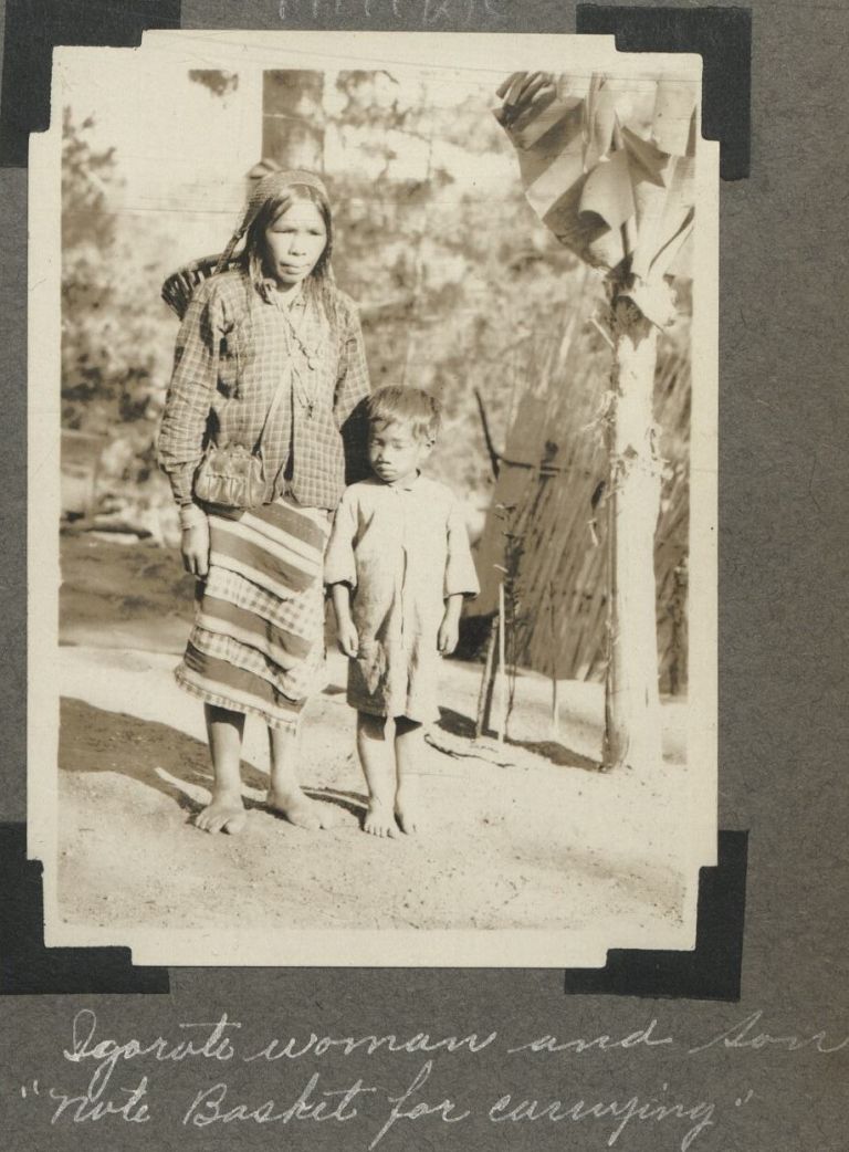 Subject: An Igorot woman, notably wearing a western-styled shirt and carrying a basket on her back, stands with her son in the sunshine.