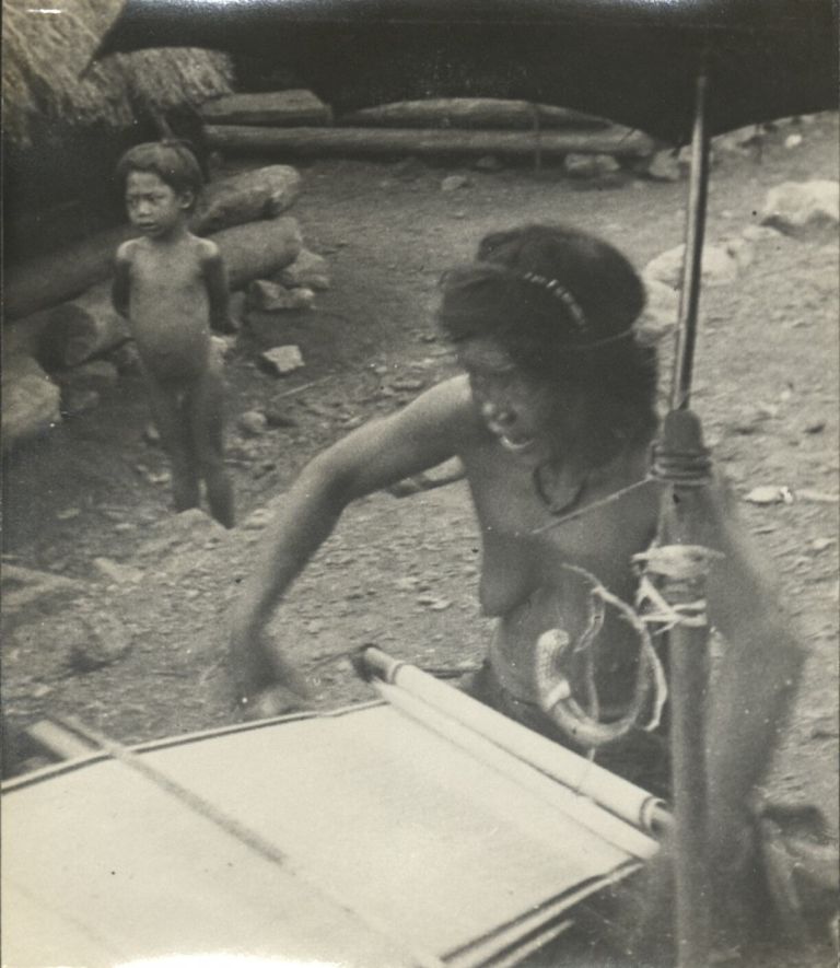 Subject: An Igorot woman weaves on a loom outdoors with a young boy in the background. She has an umbrella lashed to a pole for protection from sun and rain.