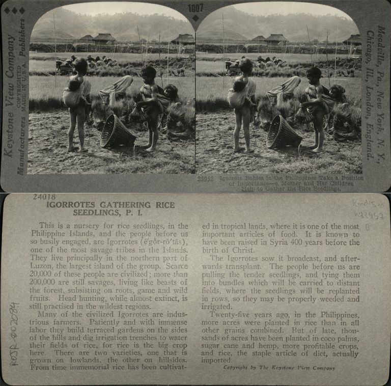 Keystone #K33952-II. Igorot children help their mother gather rice seedlings for tansplanting in northern Luzon, Philippines.