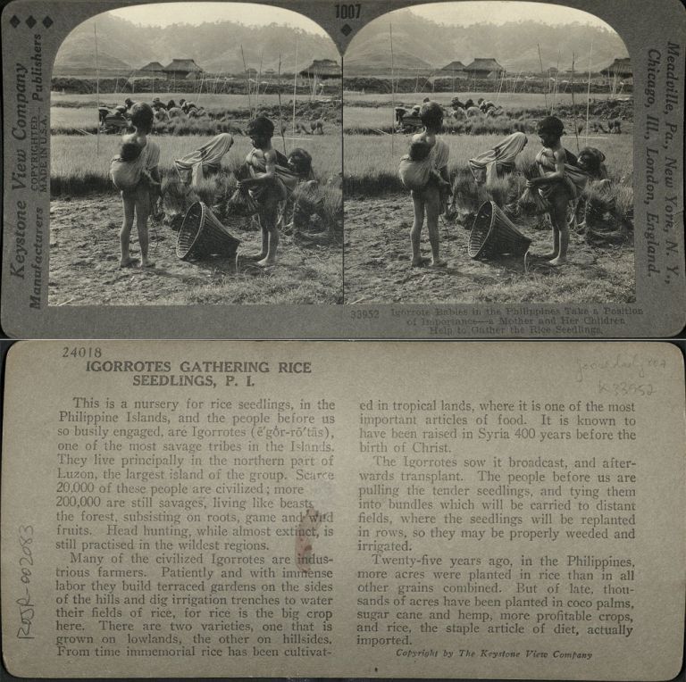 Keystone #K33952-II. Igorot children help their mother gather rice seedlings for tansplanting in northern Luzon, Philippines.