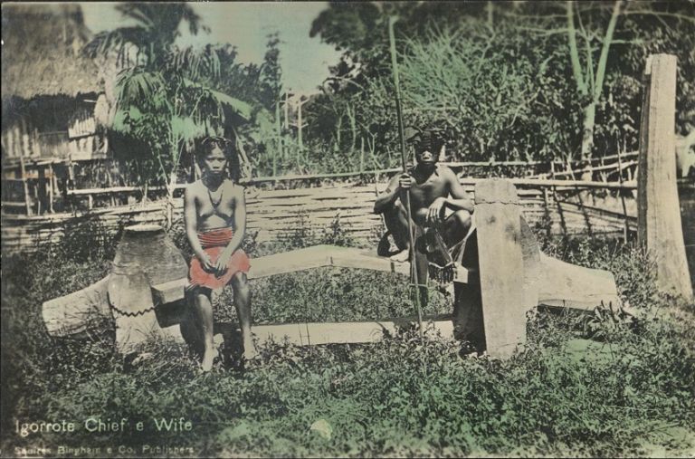 Subject: Igorot chief holding spear, bare-chested woman sitting on bench with nipa hut in background.