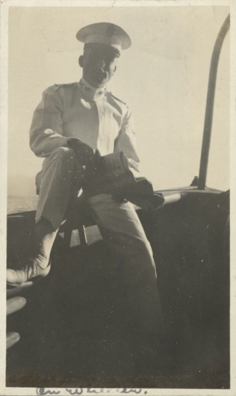 Subject: A U.S. Navy officer stands in the bow of a small boat, probably in Subic Bay.