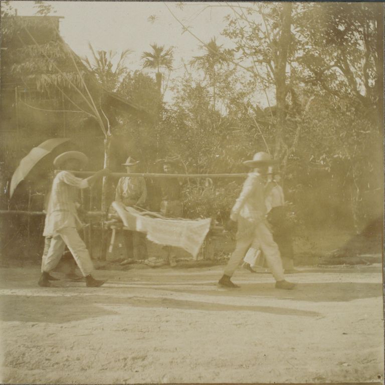 Subject: A simple funeral procession, with two men carrying the shrouded body from a shoulder pole. Contrast this with the extravagance seen in OFI-000196, ROJR-001279 or ROJR-001088.