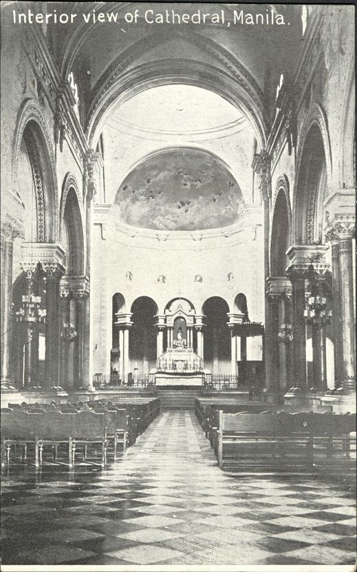 Subject: Interior view of Manila Cathedral: aisle, pews, arches, dome, and altar
