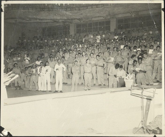 Subject: A large Filipino and American servicemen's choir, consisting of both Army and Navy personnel, stands in an auditorium in Manila in December, 1945, rehearsing Handel's "Messiah" for a concert.