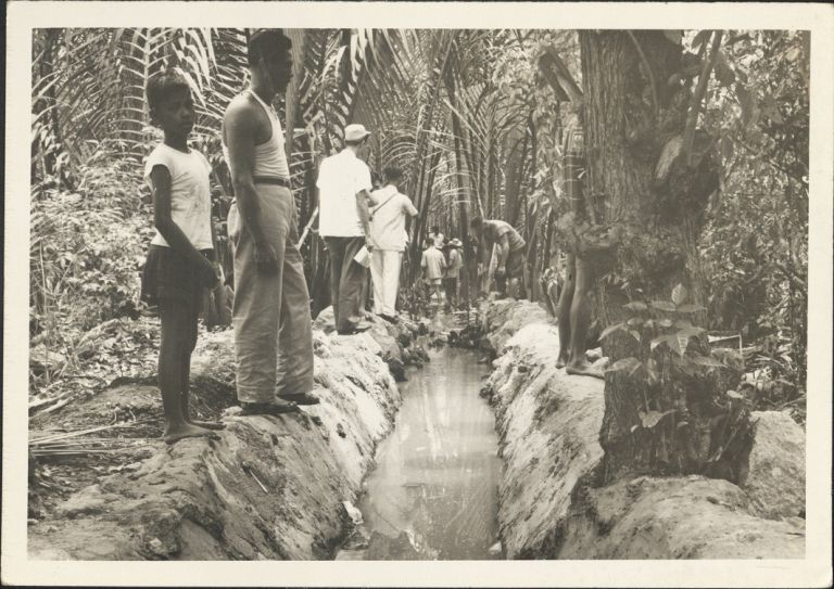 Subject: Filipino men and boys stand around an in an iggigation ditch dug straight therough the jungle - an impressive feat, digging through the tangled roots of the jungle floor.