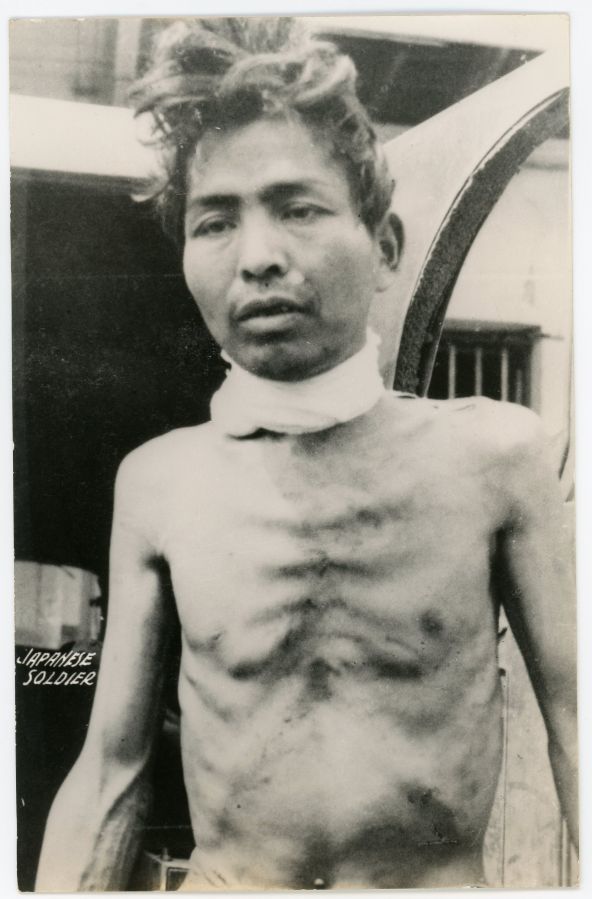 Surrendering or captured Japanese soldier appears shirtless and emaciated. Location not given but likely Central or Northern Luzon. Images in this album are from an American soldier in the U.S. Army 13th Air Force stationed at Clark Field.