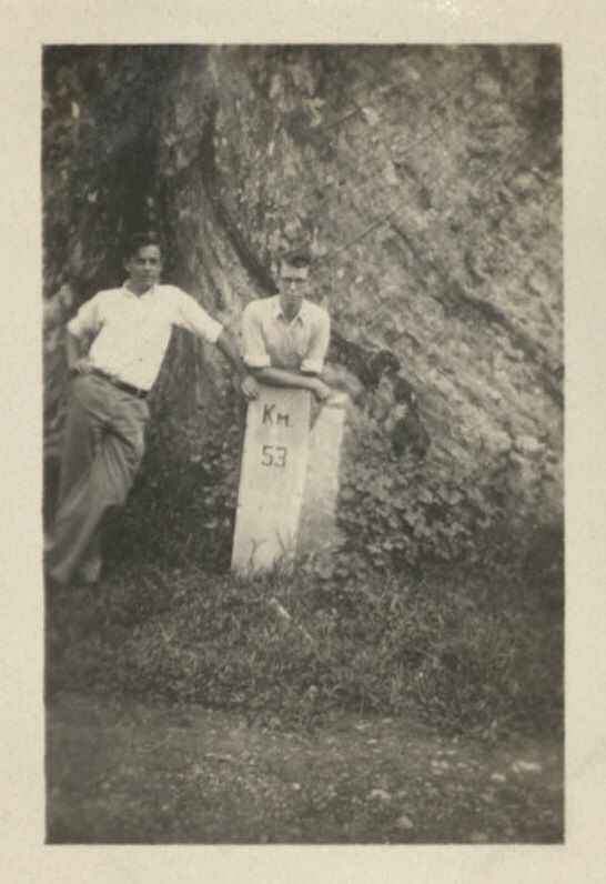 Subject: Harry Jr. and Jim, classmates at Brent School, pose in front of a massive Philippine mahogany (Lauan) tree trunk on a roadside. Botanically, Philippine mahogany refers to Toona calantas, but