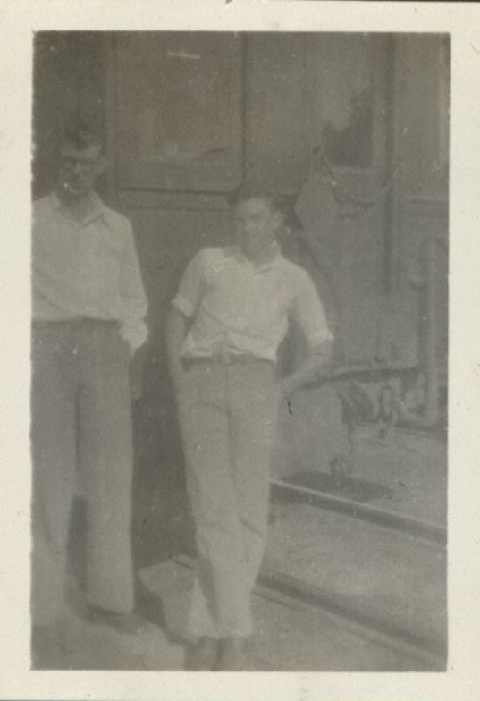 Subject: Harry Hawkins Jr. (left) and his good friend and classmate from Brent School at a train station, possibly at Paco in Manila. This sub-series of photos covers a trip Harry Jr. and Jim made fro