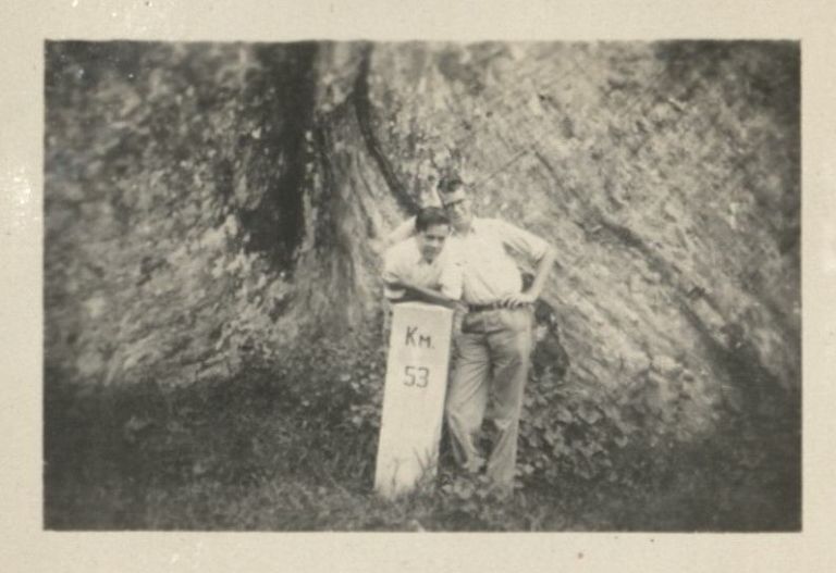 Jim [Stapler] and myself [Harry Hopkins, Jr.] before a huge mahogany tree,