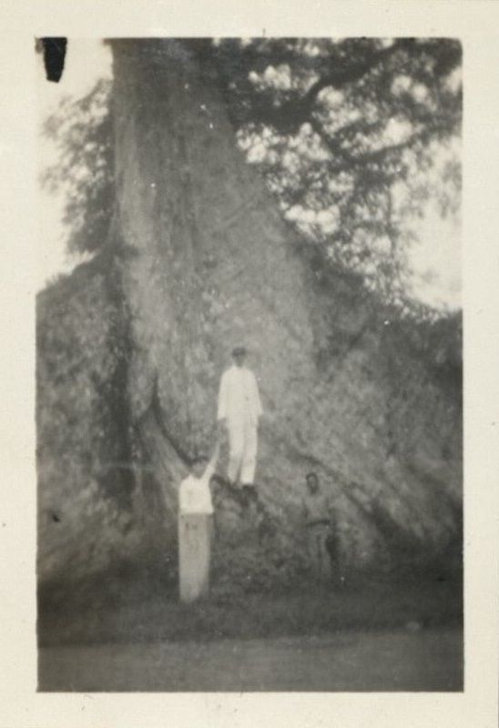 Subject: Harry Sr., Jim, and a Filipino man (Felipe) pose in front of a massive Philippine mahogany (Lauan) tree trunk on a roadside. Botanically, Philippine mahogany refers to Toona calantas, but in