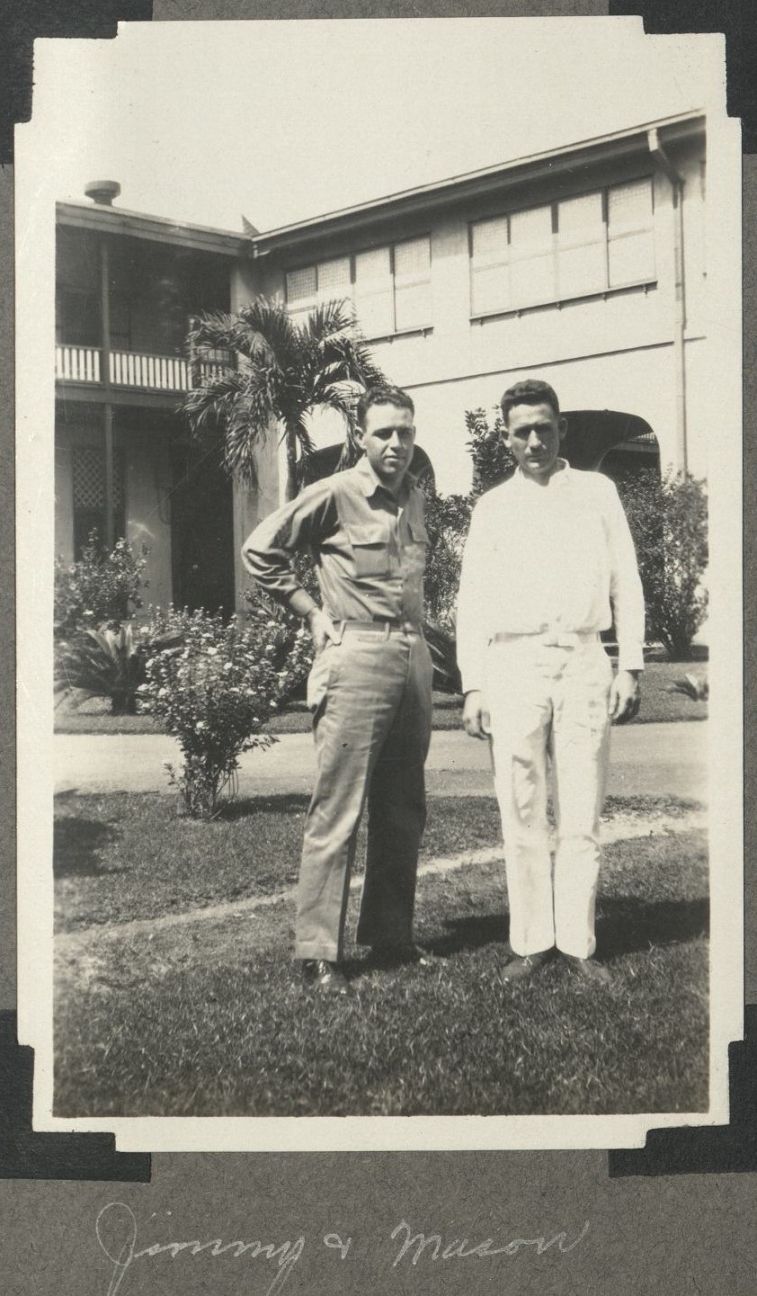 Subject: Probably two airmen buddies of Lester Brundege stand on the grass courtyard of the military hospital known as Sternberg Hospital at Calle Arroceros and Calle Conception in Ermita near Intamur