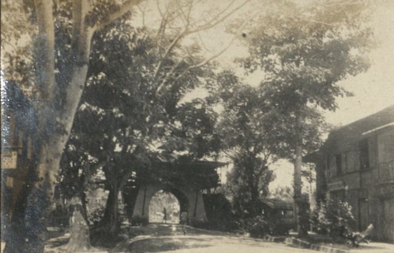 Subject: Gate into the city of Jolo seen amid shady street trees.