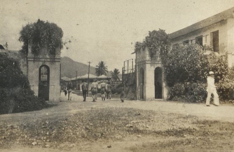 Subject: Gatehouses of Jolo. These appear to be different gates than at the pier (and seen in OFI-004412). Mountain in the background may be Mt. Dajo.