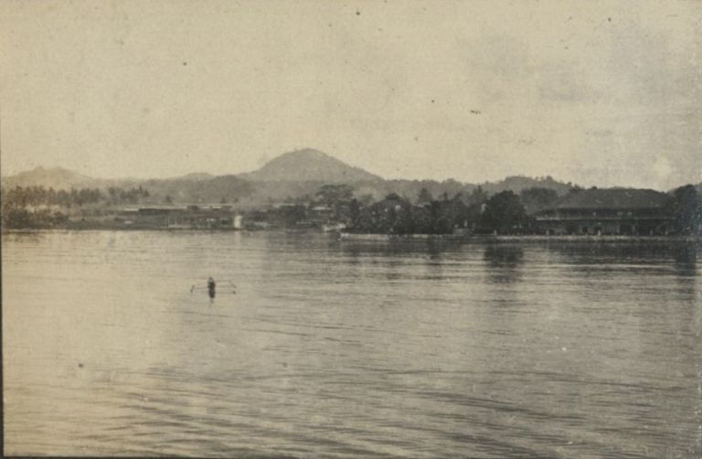 Subject: An outrigger canoe in the harbor of Jolo. The cinder-cone mountain is Mt. Dajo, scene of a famous battle in the Moro Uprising of 1906.