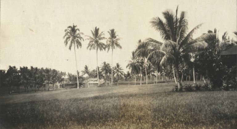 Subject: Coconut palms and a field (rice?) with buildings in distance and extreme right. This is the only image on the page captioned as Jolo. The appearance and order evokes a military camp.
