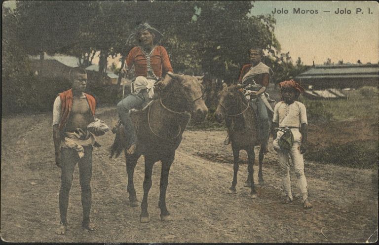Subject: Two Philippine Muslim men on horseback, two men standing alongside on road in Jolo.