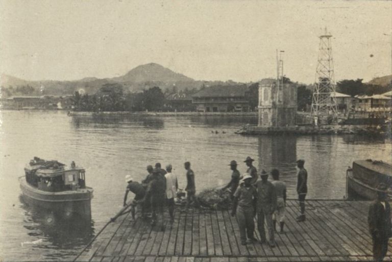 Subject: U.S. soldiers await a boat at the pier of Jolo. See also ROJR-000800 for a similar view a decade earlier. The cinder-cone mountain is Mt. Dajo, scene of a famous battle in the Moro Uprising o