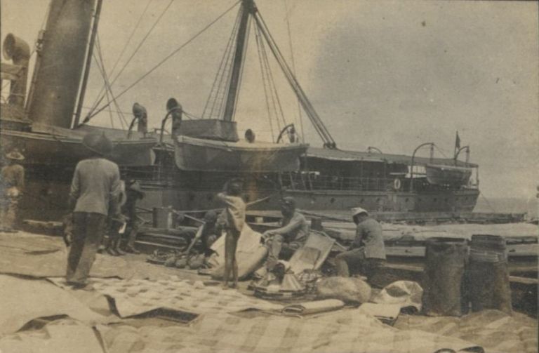Subject: U.S. soldiers stand near an army transport ship tied up to the pier at Jolo. Local men sit near either blankets or sails in the sun. See also OFI-004421.